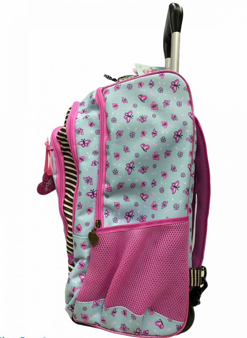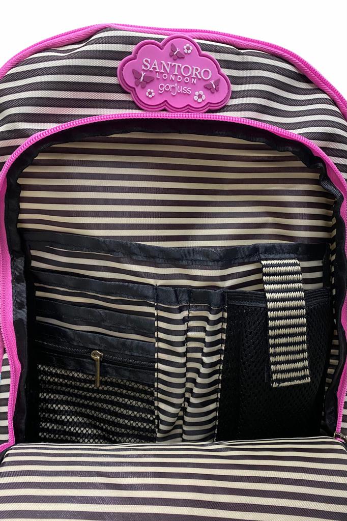 Il trolley Gorjuss Cherry Blossom by Santoro London è uno zaino con ruote, composto da tre scomparti molto capienti ,dotato di spallacci regolabili ripiegabili e di due tasche laterali elasticizzate. La maniglia del carrello è regolabile in altezza.